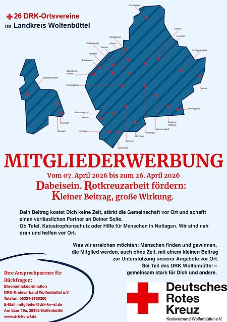Im Zeitraum vom 07. April bis einschließlich 26. April führt der DRK-Kreisverband Wolfenbüttel e. V. gemeinsam mit den ortsansässigen Ortsvereinen eine Haustürmitgliederwerbung in der Samtgemeinde Sickte und in Teilen der Samtgemeinden Elm-Asse, Oderwald und Baddeckenstedt durch. Ziel der Aktion ist es, Bürgerinnen und Bürger über die vielfältige Arbeit des Deutschen Roten Kreuzes zu informieren und neue Mitglieder zu gewinnen. In dem genannten Zeitraum sind folgende werbende Personen unterwegs: Suna Ezzi, Dennis Alo, Rufeida Nikonenko, Johannes Huonker, Lennart Fehr, Elizaveta Pashin und Orlando Prestifilippo.