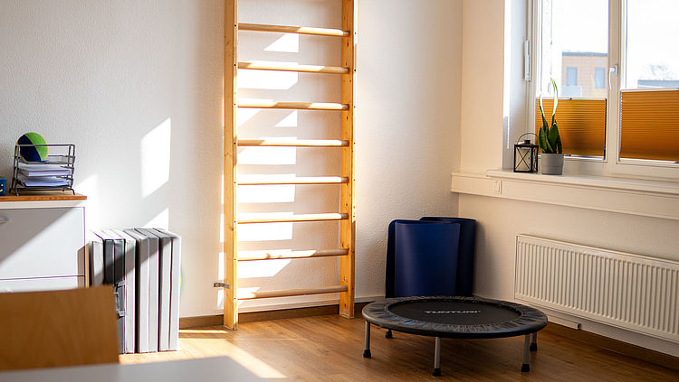 Unser Bewegungsraum ist mit einem weichen Turnhallenboden, einer Sprossenwand und mit vielfältigem Spiel- und Therapiematerial ausgestattet. Vor allem das fest installierte Schaukelsystem und Großbausteine in diesem Raum sind bei unseren kleineren Patienten sehr beliebt. Hier wird grenzenloser Spaß geboten - für eine vielseitige Therapie.