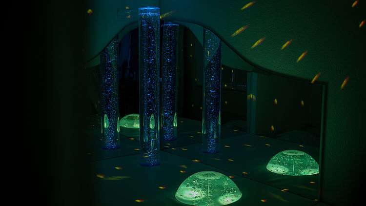 In diesem reizarmen Raum ist Entspannung möglich. Außerdem fällt einigen Patient*innen das kognitive Arbeiten hier viel leichter. Der Raum ist mit einem Entspannungsbereich und einem Arbeitsplatz für zwei Personen ausgestattet.