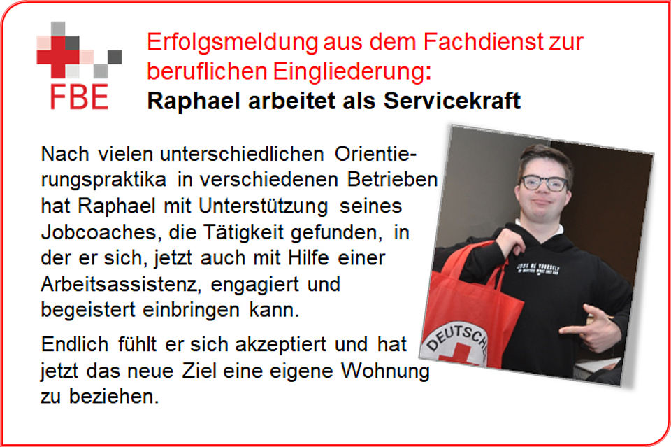 Dies ist ein Angebot für junge Menschen mit klassischer Werkstattempfehlung (WfbM - Werkstatt für behinderte Menschen), die einen Arbeitsplatz auf dem allgemeinen Arbeitsmarkt suchen. Der Betriebliche Berufsbildungsbereich bietet die Möglichkeit beruflicher Orientierung in unterschiedlichen Arbeitsfeldern. Die Dauer beträgt in der Regel 27 Monate. Im ersten Jahr können bei Betriebserprobungen die eigenen Stärken am Arbeitsplatz erlebt werden. Im zweiten Jahr werden die erlernten Fähigkeiten dann in einem ausgewählten Betrieb gefestigt, damit die Eingliederung auf dem allgemeinen Arbeitsmarkt möglich werden kann. >> mehr Infomationen zum Betrieblichen Berufsbildungsbereich
