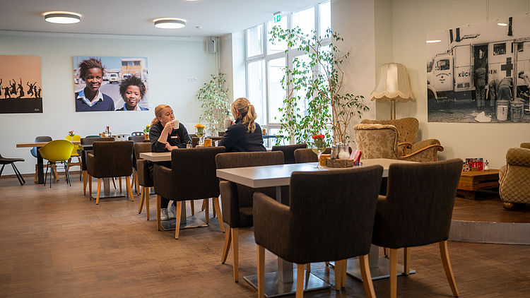 Die Lounge ist der Treffpunkt für einen heißen Kaffee oder Tee bzw. für ein leckeres Frühstück. Ebenso kann der Raum für kulturelle Veranstaltungen wie z. B. Lesungen gemietet werden. Ebenso eignet sie sich auch für geschäftliche Tagungen.