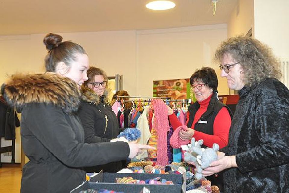 Im Eberts Hof verkauft der Stricktreff „Heiße Nadel“ handgestrickte Socken, Mützen und Pullover. Der Erlös des Verkaufs geht an DRK-Projekte, zum Beispiel an „Tafel packt Babytasche“.